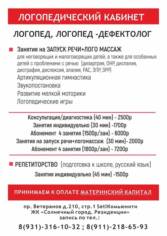 Мы ходили в садик, нам нравилось, логопед взялась за нашего сына, скоро закончим ходить наконец-то. Выбрали центр по старой дружбе, цена лояльнее, чем у многих, располагается удобно. После посещения логопеда наблюдаю положительную динамику, надеюсь до Нового года научимся говорить букву Р. Занимаемся два раза в неделю.